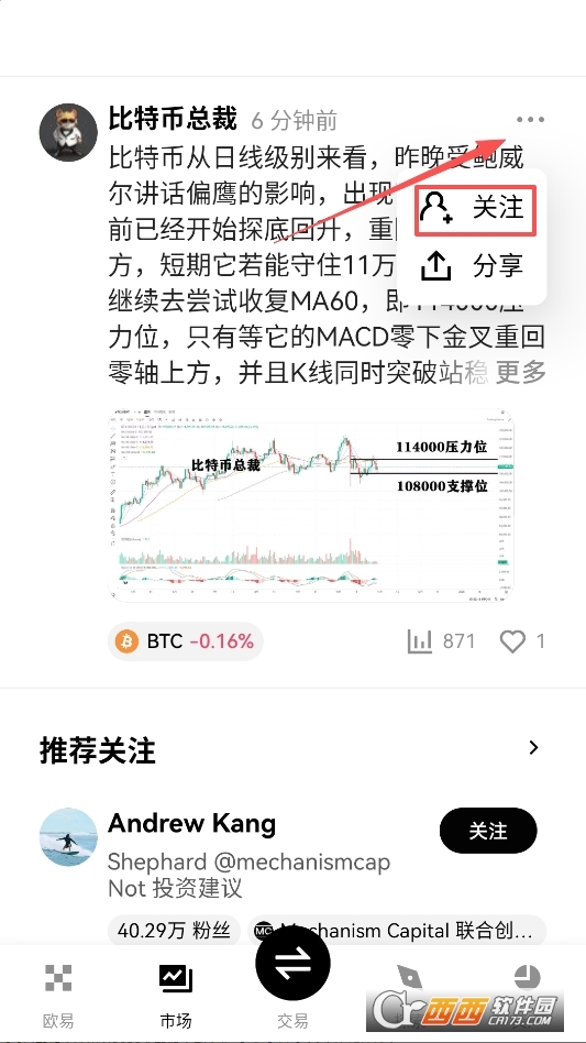 找到想要关注的对象,点击动态右上角按钮即可关注