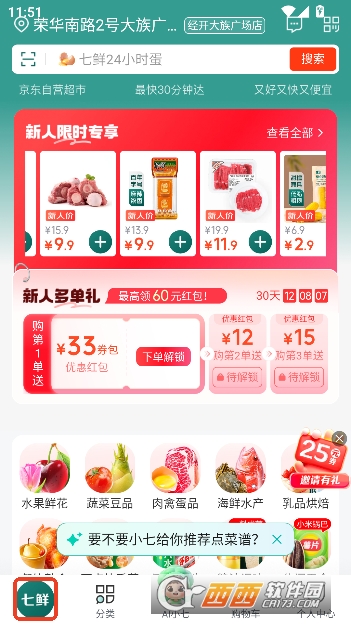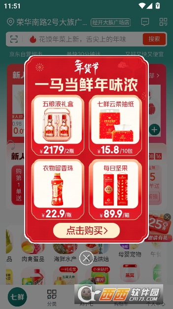 京东七鲜app年货节官方正版是一款便捷实用的在线购物电商平台,作为京东平台自营超市,拥有超百万件在线商品,涵盖水果现货,蔬菜豆皮,肉禽蛋类,乳品烘焙,酒水饮料等多种分类,点击需要的商品就能一键添加购物车进行下单购买。同时新人首次登录还能享受折扣优惠,多单礼自选红包,新人特价专享,为用户打造一站式生活购物平台。