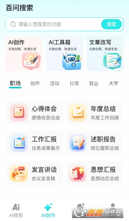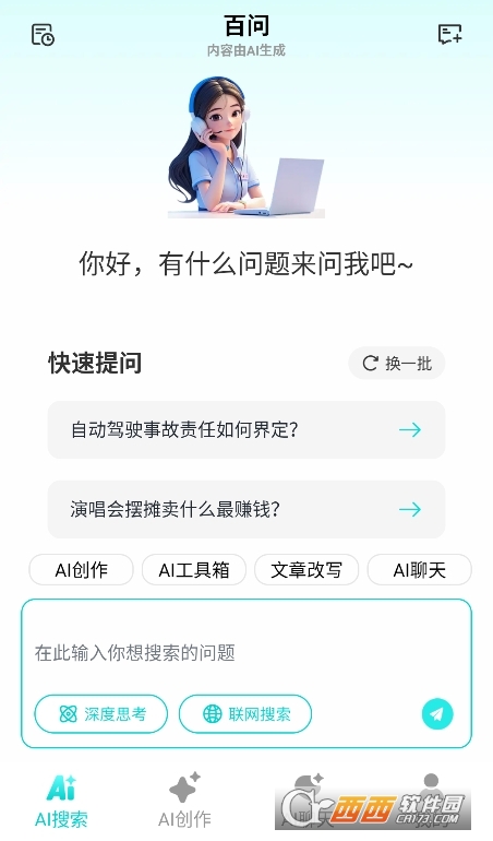 百问搜索ai助手app安卓版是一款非常好用的精彩ai智能搜索软件,提供专业的搜索平台,支持小伙伴们进行搜索功能,各种精彩应有尽有,探索全新的搜索体验,非常受欢迎,支持智能ai对话,获得更多精彩用法,有需要的就来下载试试吧。