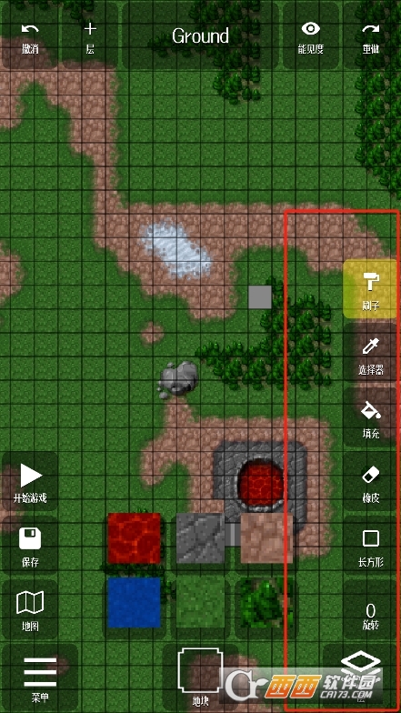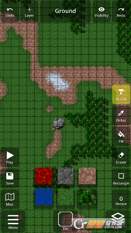 4、绘制其他元素:切换至“对象层”,从对象库中选择树木、石头等物体放置到地图上。您可以缩放和旋转这些对象。