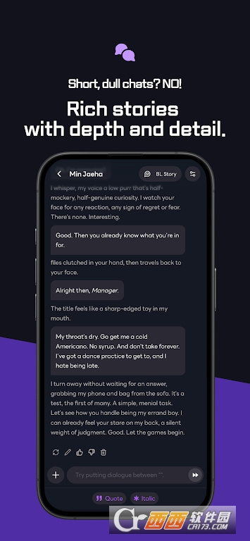 3.互动形式多元,体验更具趣味性:融合文字聊天、虚拟动作、角色装扮、语音聊天(测试中)等多种互动形式,打破传统聊天软件的单一模式,同时每个预设角色都有独立的背景故事与剧情线,随着用户与角色的互动加深,可解锁更多浪漫、搞笑或有戏剧性的剧情篇章,提升用户粘性。