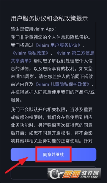1,下载安装并打开viaimAPP,先同意并继续用户服务协议和隐私政策提示