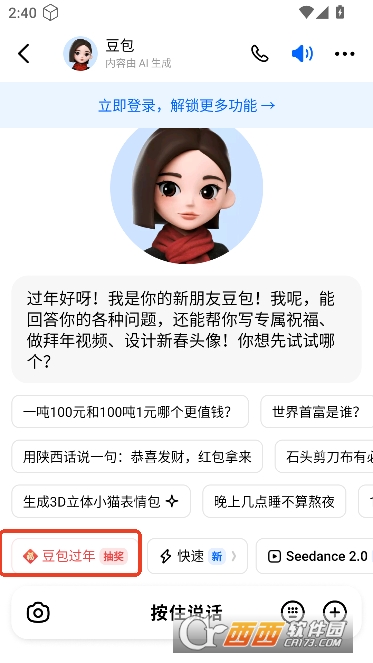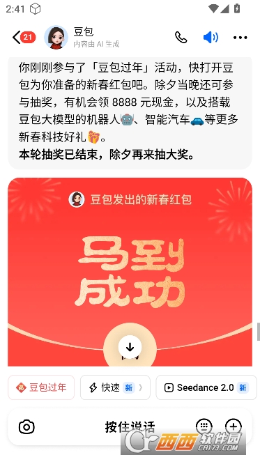 豆包app是一款便捷实用的全能AI助手,全新Seedance2.0AI创作模型,能够轻松实现写作,图像生成,编程,翻译,深入研究,会议记录,日常对话等功能,支持实时语音通话,为用户带来充满沉浸感的互动体验。新年红包活动免费参与,有机会赢取百元大奖,只需使用指定功能就能免费领取,快来参与吧。