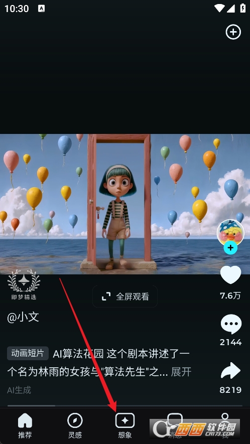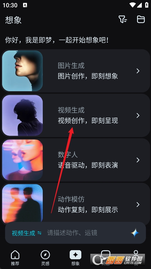 1、成功登录即梦 AI 账号后,进入首页界面,在底部功能栏找到并点击【想象】选项。