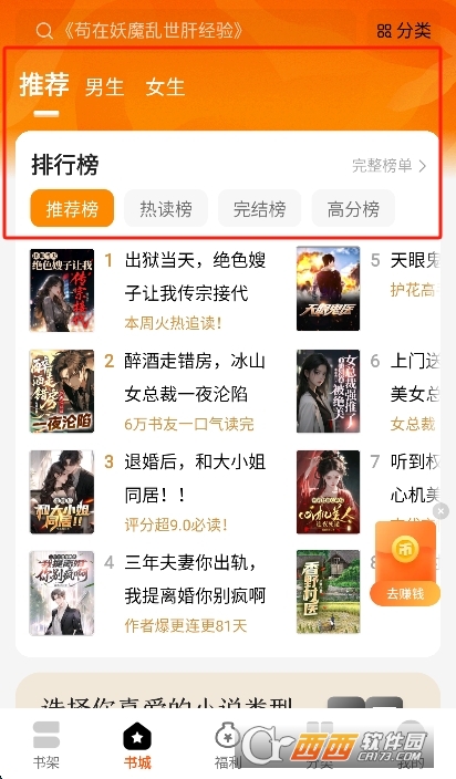 1、男女分榜,精准种草:平台精心打造"男生榜单"与"女生榜单",男生榜主打玄幻、武侠、都市爽文,女生榜聚焦言情、穿越、甜宠治愈。此外还有热搜榜、新书榜、完结榜等多维榜单,帮你轻松发现当下热门好书,彻底告别书荒焦虑。