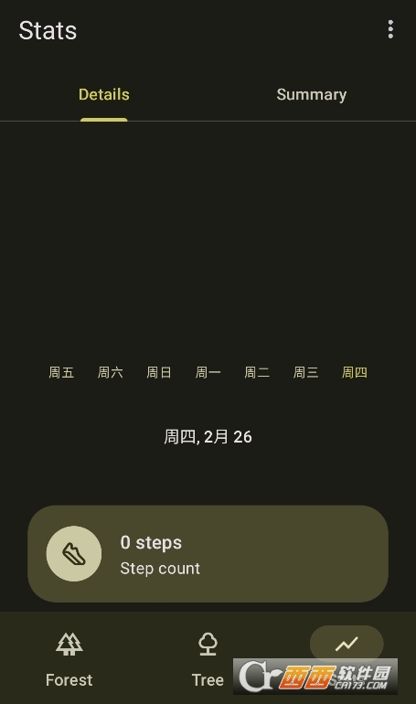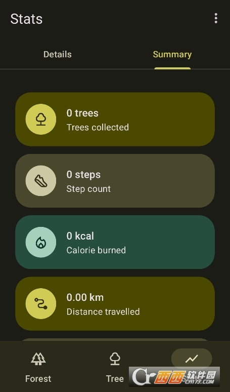 主界面以俯视图展示你拥有的整片森林,每一棵树都可点击查看详情(种植时间、达成步数、所属目标等)。