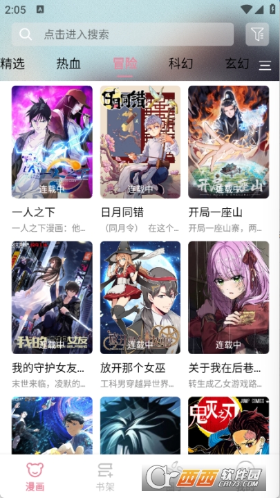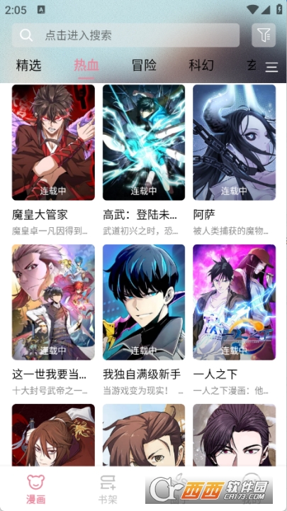 1、进入到首页以后可以看到很多的漫画资源类型,热血、科幻以及冒险等类型都有。