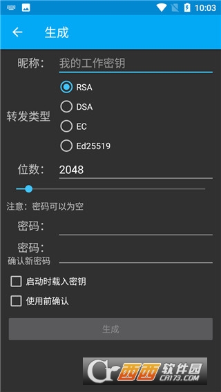 2、输入昵称,其他默认即可,如果怕别人使用自己的手机登入服务器,可以为公钥设置一个简单的密码,我们为了方便就不设置密码了。