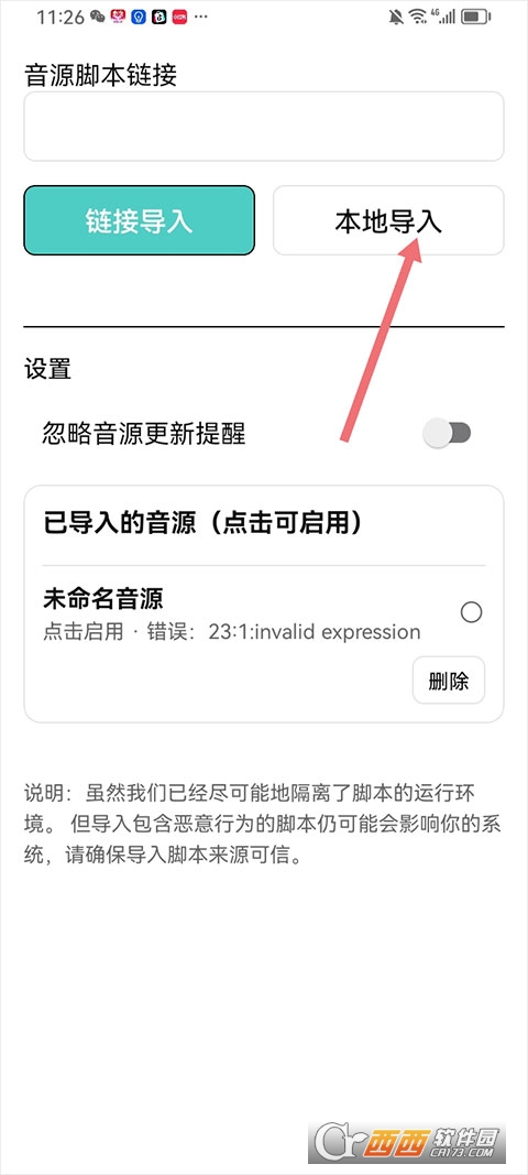 4、然后点击【本地导入】,然后将下载到手机中的音源链接json文件导入进来即可