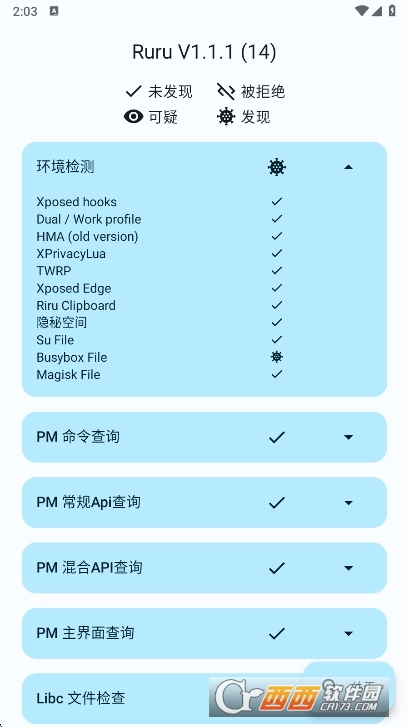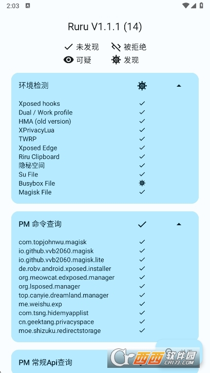 软件会自动扫描手机环境,检测Root权限、可疑应用及系统异常项,检测结果分为“未发现”“被拒绝”“可疑”“发现”四类。