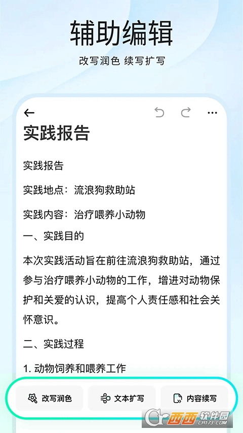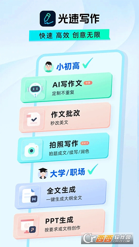 光速写作app是一款高效实用的全能创作工具,覆盖小初高、大学、职场等全场景创作需求,凭借智能AI技术为不同用户打造便捷、专业的写作体验。软件核心依托强大的AI写作引擎,输入标题即可一键生成定制化内容,支持分段创作、多版本段落选择,还能完成续写、扩写、降低重复等编辑操作,轻松化解写作思路卡顿的难题。同时配备智能批改功能,从多维度综合评定内容并精准润色,搭配海量范文素材库,助力用户积累灵感、提升创作水平。此外,工具还集成AI翻译、PPT 一键生成、多格式文件转换等实用功能,一站式满足写作、办公、学习的多元创作需求,操作简洁易上手,多端同步协作,大幅提升创作效率,是日常写作、职场办公的优质创作好帮手。