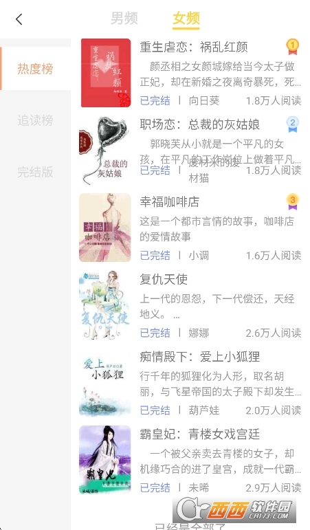 女频专区:古代言情榜、现代婚恋榜、穿越重生榜、甜宠爽文榜、豪门总裁榜等。