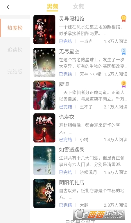 男频专区:玄幻奇幻榜、都市职场榜、武侠仙侠榜、科幻末世榜、悬疑探险榜等。