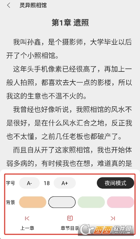 3、阅读界面点击屏幕中央可调出菜单,进行字体、背景等设置。