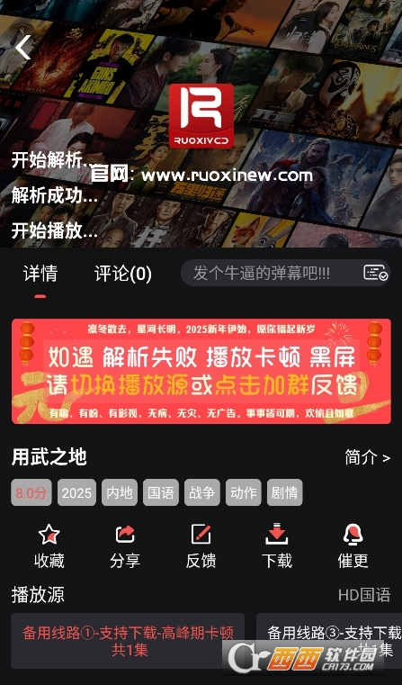 展示所有播放源和剧集列表,点击即可播放。