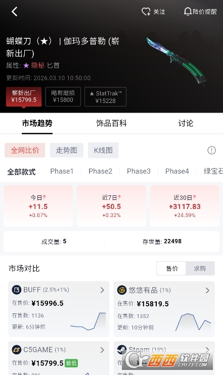 FirePulse最核心的优势在于整合了全网主流三方平台的数据。你不再需要同时打开多个网站对比价格,一个FirePulse就能看到所有平台的实时报价。每个饰品页面都清晰展示各平台当前最低价、最高价、在售数量,方便你快速做出决策。