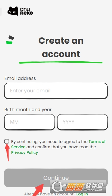 2、输入电子邮箱和出生年月,勾选协议,点击Continue按钮。