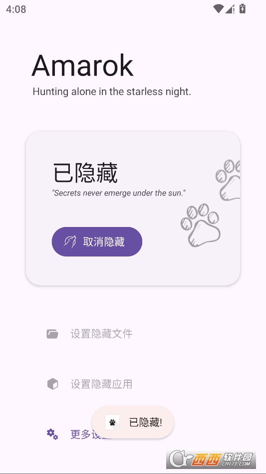 Amarok定位为“操作简便、多模式适配、轻量安全”的隐私保护工具,界面采用简约现代化设计,功能分区清晰,适配安卓全版本设备,Root与免Root设备均能兼容使用,无需复杂引导,新手几分钟即可熟悉全部操作。软件核心功能是一键隐藏隐私文件和应用,通过混淆文件名、签名或停用应用的方式实现隐匿,不修改文件本身内容,秒级完成隐藏操作;支持多种隐藏模式,可根据设备情况灵活选择,同时具备快捷隐藏、取消隐藏功能,搭配控制中心快捷开关,无需打开应用即可快速操作,实用性拉满。