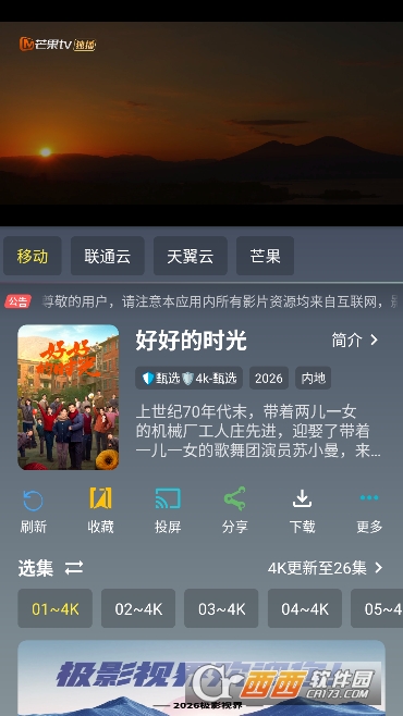画质体验出色:平台主打 4K 高清片源,画质清晰锐利、细节饱满,无模糊、锯齿与噪点。声音还原度高、环绕感强,搭配流畅播放体验,沉浸式感极强。无论是手机小屏还是投屏到大屏电视,都能呈现高品质视听效果。