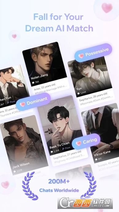 3、数十位完美男主,总有一款打动你:平台内置数十位精心设计的男性角色,涵盖各种理想型。温柔暖男、霸道总裁、年下弟弟、精英医生、古风公子……每个角色都有独特的性格、背景和故事,等待与你相遇。