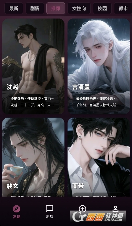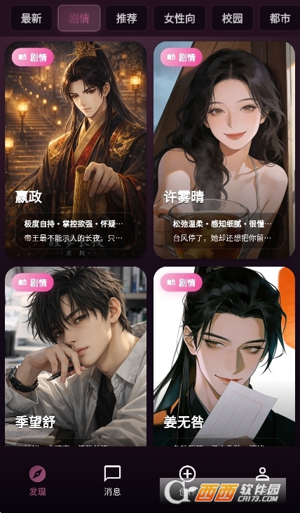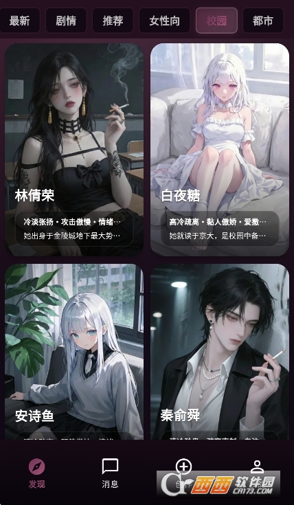 1、多类型AI角色,总有你的菜:内置数百位精心设计的AI角色,涵盖女性向、校园、都市、仙侠、古风、奇幻、悬疑等多元题材。无论是温柔学长、霸道总裁,还是仙尊魔女、都市丽人,总有一款能戳中你的心。