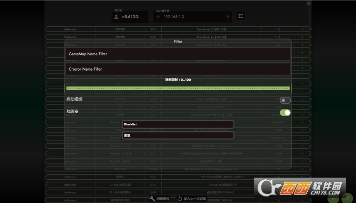 4、列表首先排列RCN房间,支持列表筛选器,包括地图名称筛选,是否启用模组,地图人数等,以及支持黑名单