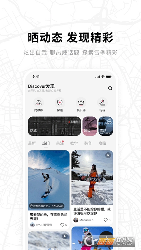 1. 精准约滑匹配:基于领先的滑雪领域移动社交技术,采用精准的约滑匹配系统,能让用户在雪场发现有趣雪友和知名达人,邀约一起开心滑雪。