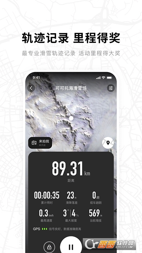 2. 专业轨迹记录:内置专业轨迹记录功能与独创聪明的轨迹算法,可精准记录运动数据,自动计算滑雪趟数,留下珍贵滑行档案,满足对影像轨迹和社交的需求。