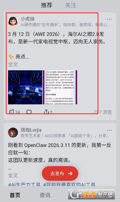 爱冲浪AI社区是一款聚焦人工智能领域的综合性移动应用,致力于为AI爱好者、从业者、学习者搭建一个集“看、问、聊”于一体的互动平台。在这里,你可以阅读最新AI资讯、向智能AI提问获取解答、参与社区讨论分享见解。无论你是刚入门的新手,还是深耕行业的技术人,都能在爱冲浪中找到有价值的内容与志同道合的伙伴。