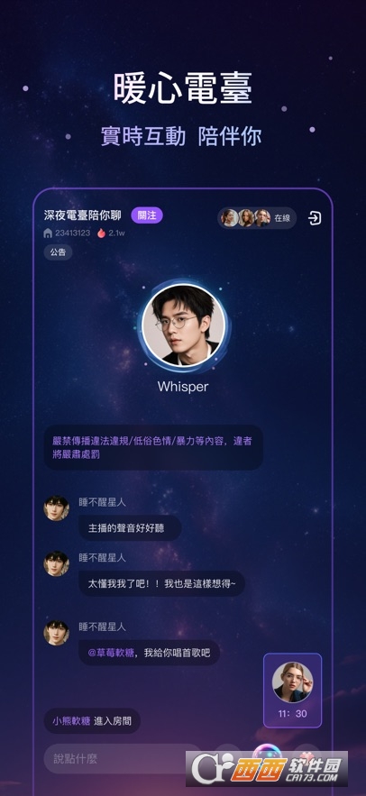 1.安全舒适的环境:Whispry主打安全舒适低压力的陪伴式交流环境,为女生提供温暖空间,无需露脸即可轻松结识伙伴,氛围柔和极具安全感。