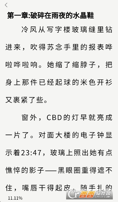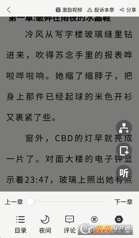 4、点击小说封面进入详情页,选择章节后进入阅读模式。点击屏幕可呼出设置菜单,调整字体、背景、亮度等。