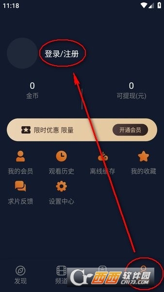 打开软件后,点击右下角“我的”,并点击左上方的“登录/注册”;
