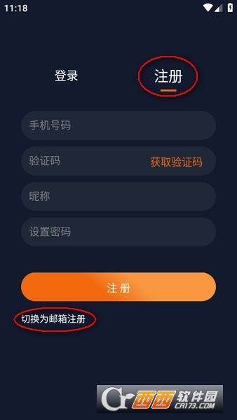 选择“注册”,默认为手机号注册,也可以“切换为邮箱注册”,填写相关信息,点击“注册”;