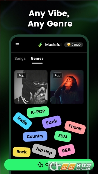 2、多风格曲库,自由切换:内置流行、摇滚、电子、古风、民谣等多种音乐风格,一键切换,适配不同创作场景。