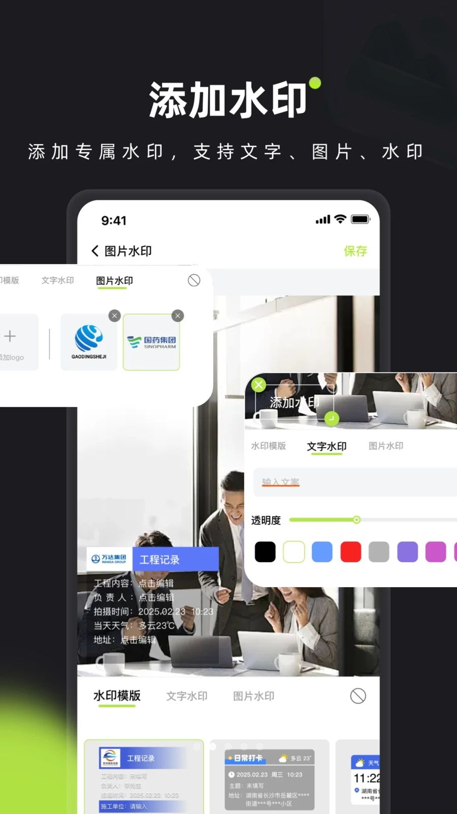 2. 水印清晰多样:支持实时添加时间、地点、经纬度、天气等水印,还有工程施工、外勤巡检等多场景模板,更能自定义水印文字颜色、大小、位置,满足不同工作场景需求。
