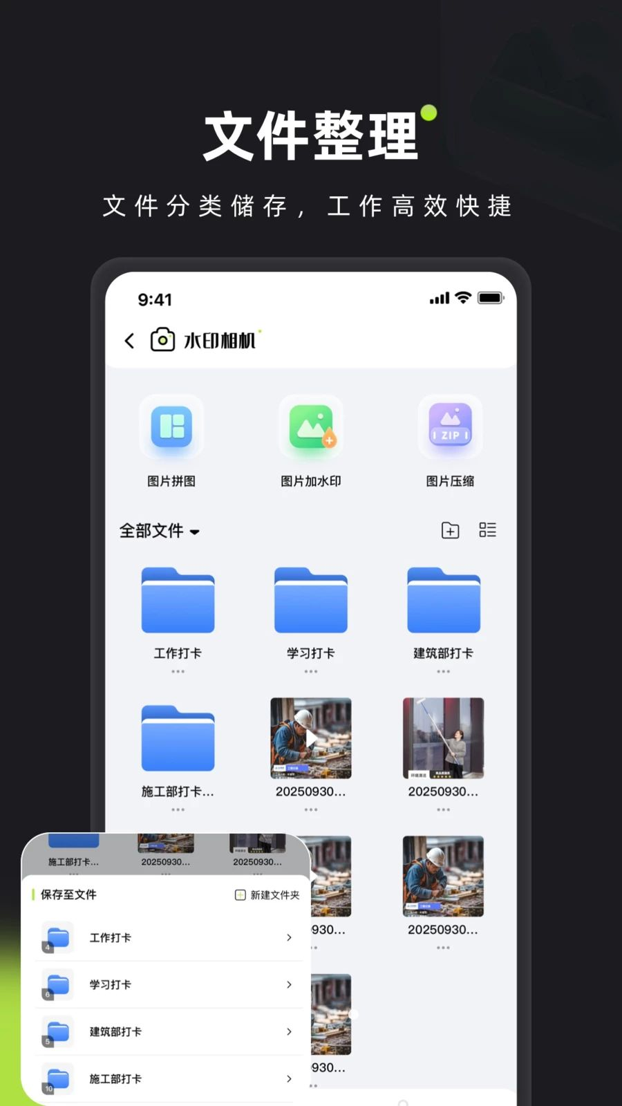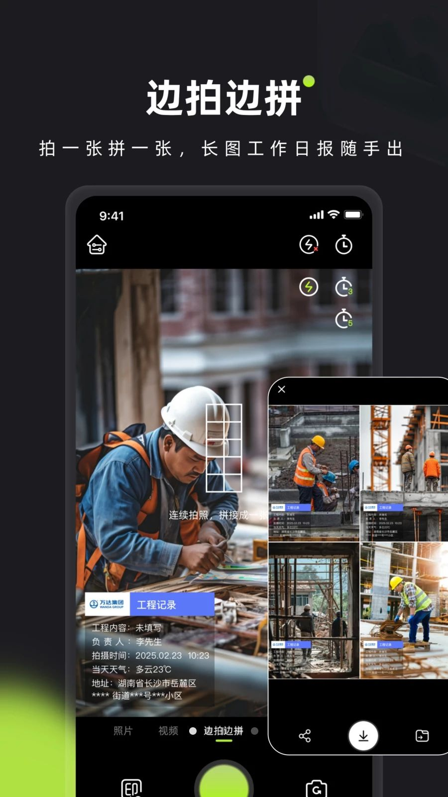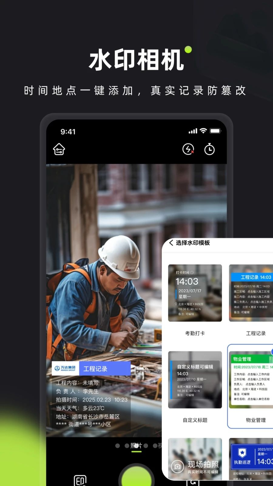 1. 支持实时添加时间地点经纬度天气工程信息等水印,适用于多种工作场景,操作简单水印清晰,一键拍摄快速保存,助力工作高效留痕。