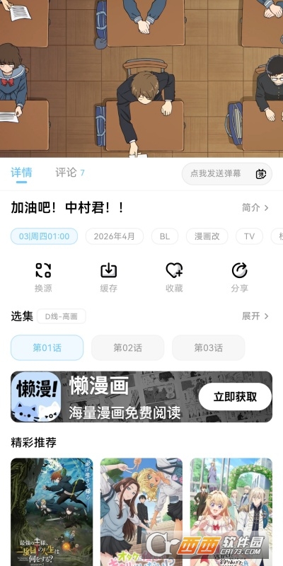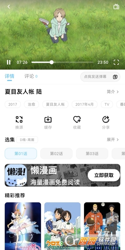 4、点击封面进入详情页,查看简介、声优、评分等信息。选择集数后进入播放界面,可切换画质、调节倍速、开启/关闭弹幕。
