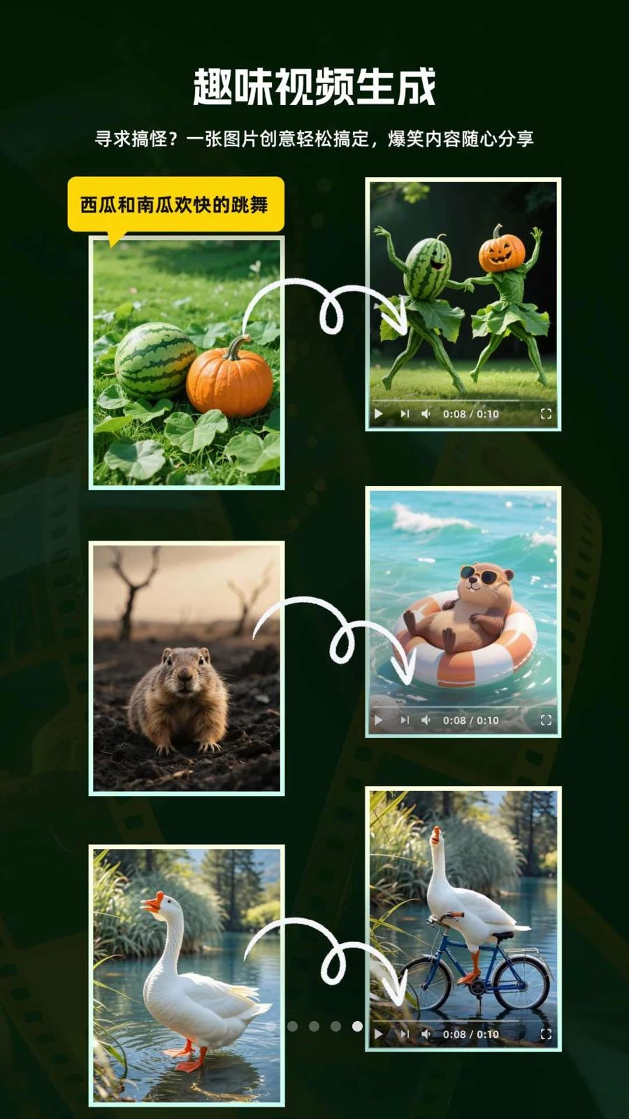 4. 趣味脑洞动画,大鹅骑车、南瓜互动等万物皆可动画,把奇思妙想变成朋友圈爆款。