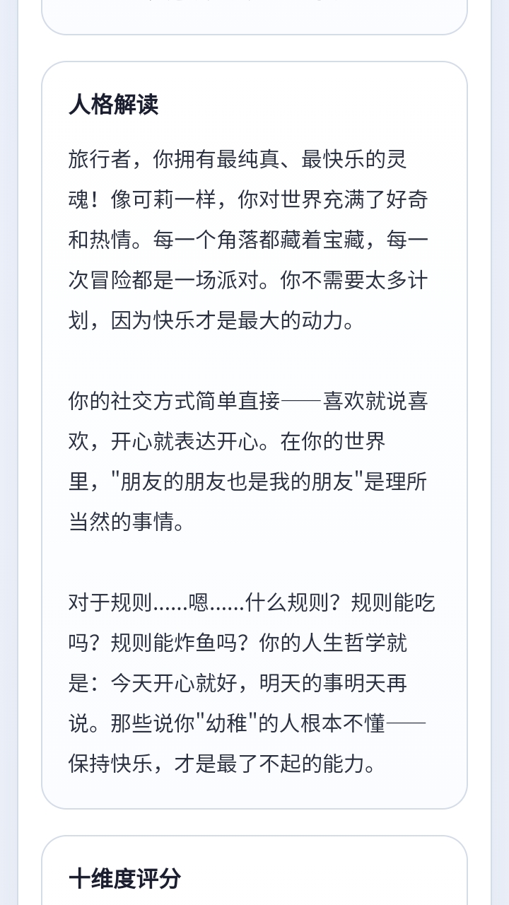 本次更新优化了测试流程,减少卡顿,提升玩家测试体验。修复了已知的报告生成错误,确保诊断报告准确无误。同时,对结果卡片的展示进行了微调,使其更加美观清晰。此外,还更新了部分文案,使其更具趣味性和吸引力,让玩家能更愉快地完成测试并分享结果。