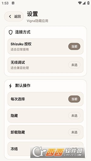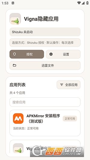 Vigna 隐藏应用app是一款专为 Android 系统打造的轻量化应用隐藏与隐私保护工具,无需 Root 手机,通过 Shizuku 授权或无线调试即可实现核心功能。软件专注于手机应用隐匿管理,能帮助用户快速隐藏各类敏感应用、保护个人数据隐私,适配 Android 6.0 及以上主流系统版本,适合家人共用手机、同事借机、防止儿童误操作等多种隐私守护场景,是追求手机使用安全与隐私独立用户的实用选择。