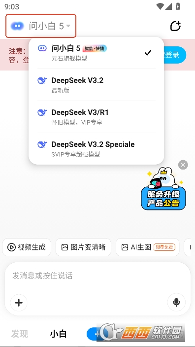 问小白极速版是一款功能全面、高效易用的AI智能助手,专为学习、办公、创作与日常生活场景打造。软件搭载强大的推理引擎,支持多模型自由切换,兼具深度思考与联网搜索能力,能快速理解用户需求,给出精准、可靠的回答。无论是文档解析、图片识别、文案写作、论文辅助,还是 AI 生图、视频生成、拍题答疑,都能一站式完成,真正实现多模态智能处理。