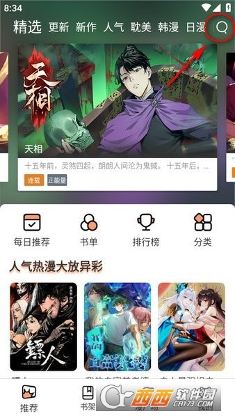 1、打开app后,点击右上角的放大镜图标,如图所示;
