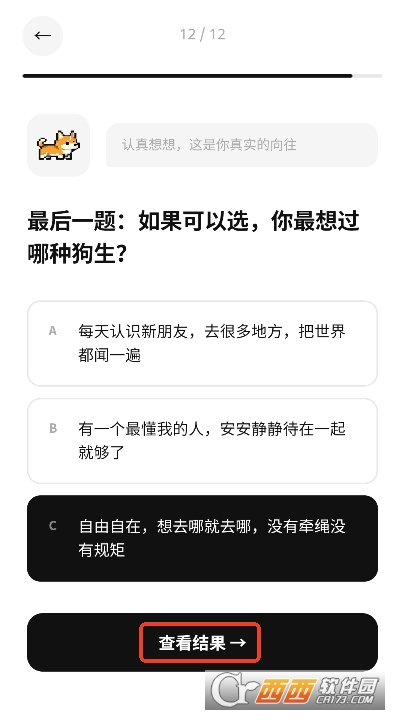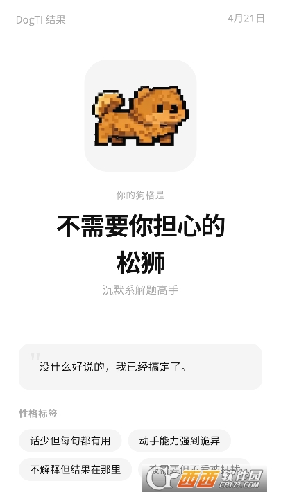 MBTI小狗人格测试软件是一款以小狗为主题的人格测试工具,将各种人格以小狗的形象显示出来,包含哈士奇,萨摩耶,金毛,柯基,田园犬,比格犬,德牧等丰富的种类,通过系统给出的12道题进行回答,做完后就能获取结果,提供性格标签,人格分析,帮助你更好地认识自己。支持一键转发分享,也可以再测一次。