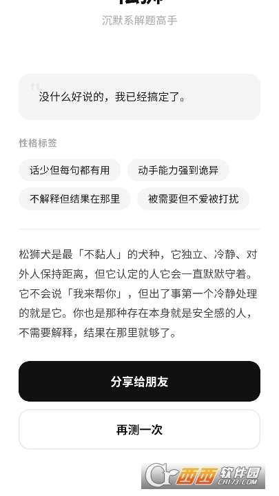 结果解读生动有趣,语言接地气易理解,贴合大众日常认知,很容易引发情感共鸣,社交话题性强,分享后能快速获得好友互动。