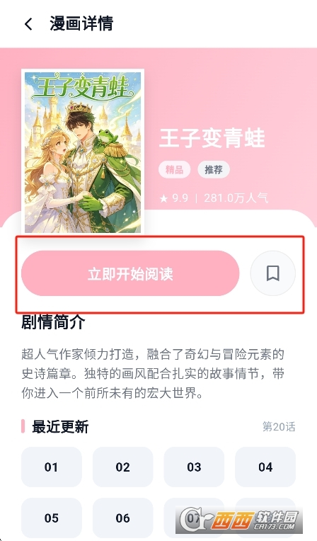 2、点击漫画封面进入详情页,查看简介、标签、目录。点击“开始阅读”进入阅读界面。
