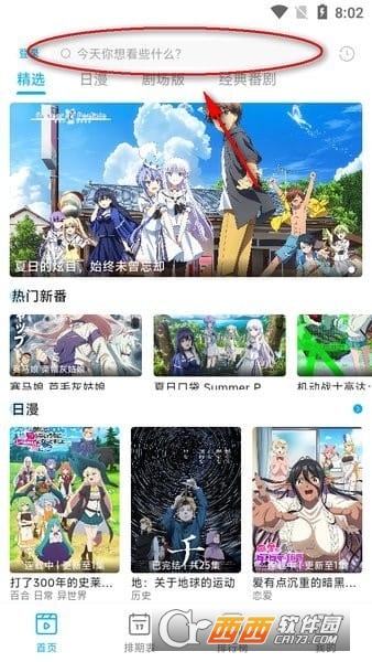 在软件“首页”选择,或者点击最上面的搜索框搜索要看的动漫;