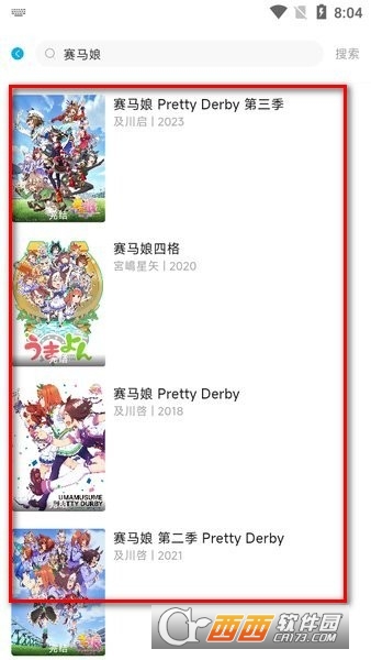 比如搜索赛马娘,就会出现相关的动漫作品,一般包含了全系列;