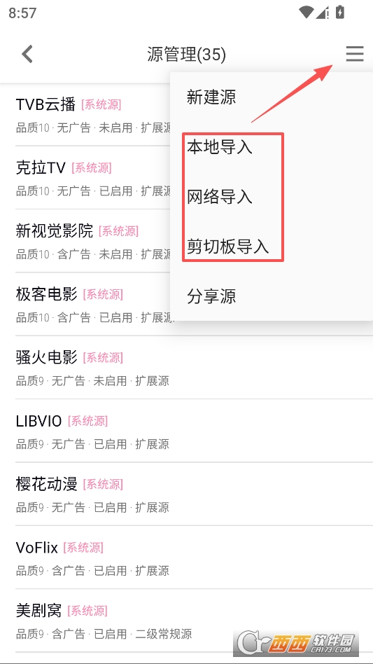 最后点击右上角按钮呼出菜单选择导入播放源即可