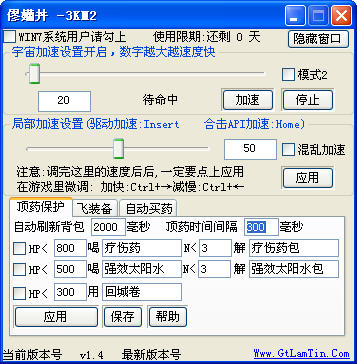 驱动加速用法:开启加速g->调节速度值->点应用->启动游戏登陆器进入游戏->按快捷键insert开启 驱动加速->再按一次停止加速