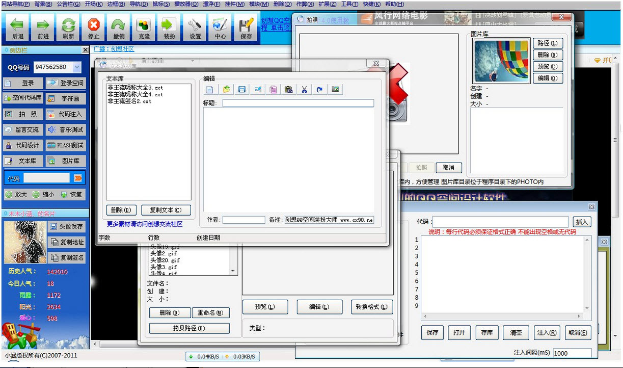 该软件是网络中最成熟的QQ空间装扮软件,制作空间不在是复杂麻烦事。支持向导式制作空间,简便易懂。批量插入代码,输入多行代码,一行一行代码插入到QQ空间,支持代码导出。QQ空间克隆,一键QQ空间克隆,快速复制其他QQ空间的代码,并支持代码导出备份。照顾分辨率小的朋友,可直接放大页面缩小页面。完美的名片功能,可随意保存头像、复制签名等。支持设置默认QQ号码,方便下次使用。大量皮肤、开场、边框、导航、鼠标、播放器、漂浮、挂件自带素材,单击直接插入QQ空间。快捷键关闭QQ空间音乐。QQ空间代码库/图片库/文本库 大量QQ空间个性代码、昵称、签名。音乐测试、FLASH测试上传。优化的湛蓝色界面、清爽整齐。无插件、登录方式安全、自动升级等特性绝对值得使用!可以全部总结为:简便、强大、易用、方便、免费。
